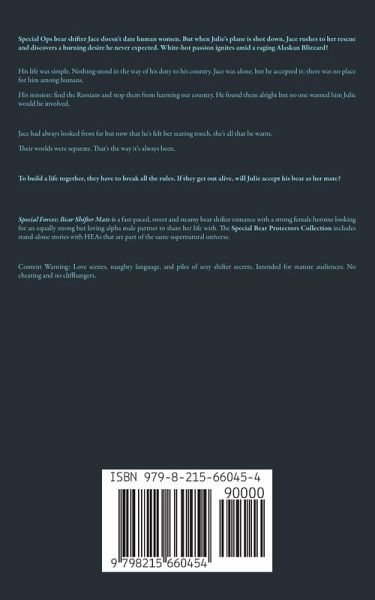 Special Ops bear shifter Jace doesn't date human women. But when Julie's plane is shot down, Jace rushes to her rescue and discovers a burning desire he never expected. White-hot passion ignites amid a raging Alaskan Blizzard! His life was simple. Nothing stood in the way of his duty to his country. Jace was alone, but he accepted it; there was no place for him among humans. His mission: find the Russians and stop them from harming our country. He found them alright but no one warned him Julie would be involved. Jace had always looked from far but now that he's felt her searing touch, she's all that he wants. Their worlds were separate. That's the way it's always been. To build a life together, they have to break all the rules. If they get out alive, will Julie accept his bear as her mate? Special Forces: Bear Shifter Mate is a fast-paced, sweet and steamy bear shifter romance with a strong female heroine looking for an equally strong but loving alpha male partner to share her life with. The Special Bear Protectors Collection includes stand-alone stories with HEAs that are part of the same supernatural universe. Content Warning: Love scenes, naughty language, and piles of sexy shifter secrets. Intended for mature audiences. No cheating and no cliffhangers.