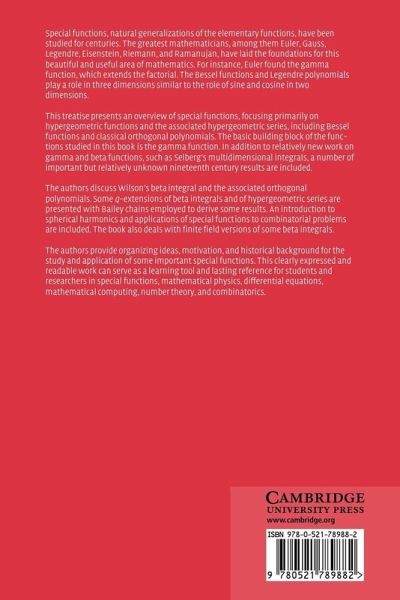 Special functions, which include the trigonometric functions, have been used for centuries. Their role in the solution of differential equations was exploited by Newton and Leibniz, and the subject of special functions has been in continuous development ever since. In just the past thirty years several new special functions and applications have been discovered. This treatise presents an overview of the area of special functions, focusing primarily on the hypergeometric functions and the associated hypergeometric series. It includes both important historical results and recent developments and shows how these arise from several areas of mathematics and mathematical physics. Particular emphasis is placed on formulas that can be used in computation. The book begins with a thorough treatment of the gamma and beta functions that are essential to understanding hypergeometric functions. Later chapters discuss Bessel functions, orthogonal polynomials and transformations, the Selberg integral and its applications, spherical harmonics, q-series, partitions, and Bailey chains. This clear, authoritative work will be a lasting reference for students and researchers in number theory, algebra, combinatorics, differential equations, applied mathematics, mathematical computing, and mathematical physics.