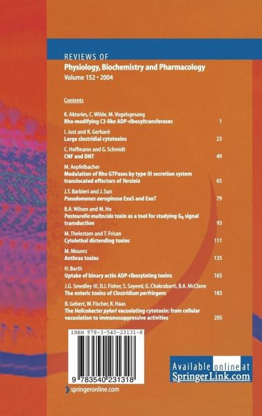 K. Aktories, C. Wilde, and M. Vogelsgesang: Rho-Modifying C3-like ADP-Ribosyltransferases.- I. Just and R. Gerhard: Large Clostridial Cytotoxins.- C. Hoffmann and G. Schmidt: CNF and DNT.- M. Aepfelbacher: Modulation of Rho GTPases by Type Three Secretion System Translocated Effectors of Yersinia.- J.T. Barbieri and J. Sun: Pseudomonas Aeruginosa ExoS and ExoT.- B.A. Wilson and M. Ho: Pasteurella Multocida Toxin as a Tool for Studying Gq Signal Transduction.- M. Thelestam and T. Frisan: Cytolethal Distending Toxins.- M. Mourez: Anthrax Toxins.- H. Barth: Uptake of Binary Actin ADP-Ribosylating Toxins.- J.G. Smedley, III, D.J. Fisher, S. Sayeed, G. Chakrabarti, and B.A. McClane: The Enteric Toxins of Clostridium Perfringens.- B. Gebert, W. Fischer, R. Haas: The Helicobacter Pylori Vacuolating Cytotoxin: From Cellular Vacuolation to Immunosuppressive Activities.