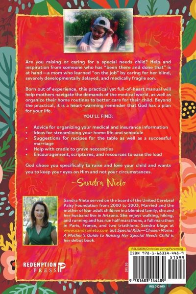Are you raising or caring for a special needs child? Help and inspiration from someone who has "been there and done that" is at hand-a mom who learned "on the job" by caring for her blind, severely developmentally delayed, and medically fragile son. Born out of experience, this practical yet full-of-heart manual will help mothers navigate the demands of the medical world, as well as organize their home routines to better care for their child. Beyond the practical, it is a heart-warming reminder that God has a plan for your life. You'll find: Advice for organizing your medical and insurance information Ideas for streamlining your home life and schedule Suggestions for recipes for the table as well as a successful marriage Help with cradle to grave necessities Encouragement, Scriptures, and resources to ease the load. God chose you specifically to raise and love your child and wants you to keep your eyes on him and not your circumstances. -Sandra Nieto