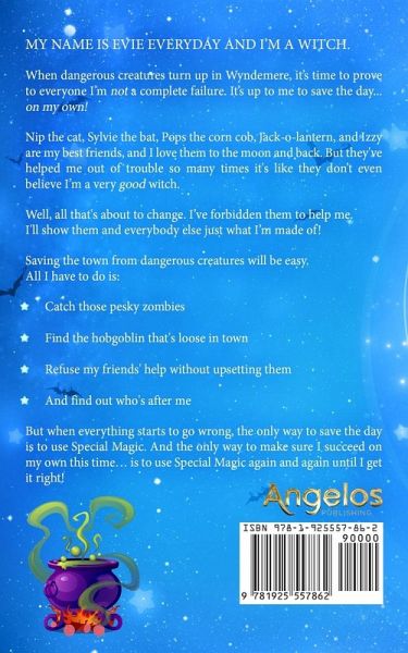 When dangerous creatures turn up in Wyndemere, it's time to prove to everyone I'm not a complete failure. It's up to me to save the day... on my own! My name is Evie Everyday, and I'm a witch. Nip the cat, Sylvie the bat, Pops the corn cob, Jack-o-lantern, and Izzy are my best friends, and I love them to the moon and back. But they've helped me out of trouble so many times it's like they don't even believe I'm a very good witch. Well, all that's about to change. I've forbidden them to help me. I'll show them and everybody else just what I'm capable of! Saving the town from dangerous creatures should be easy. All I have to do is:Catch those pesky zombies Find the hobgoblin that's loose in town Refuse my friends' help without upsetting them And find out who's after me But when everything starts to go wrong, the only way to save the day is to use Special Magic. And the only way to make sure I succeed on my own this time... is to use Special Magic again and again until I get it right! Evie Everyday Witch is a series of chapter books that kids and parents will love. Ideal for reluctant readers. Evie's quirky, funny personality will sweep kids off their feet and get them reading again!