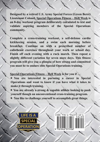 Designed by a retired U.S. Army Special Forces (Green Beret) Lieutenant Colonel, Special Operations Fitness - Hell Week is an 8-day workout program deliberately calculated to test and validate aspiring members of the Special Operations community. Complete a cross-training workout, a self-defense cardio kickboxing session, and a swim each morning before breakfast. Continue on with a prescribed number of calisthenic exercises throughout your work or school day. Finish off each evening with a ruck march. Then repeat a slightly different variation for seven more days. This fitness program will give you a glimpse of how strong and committed you must be to endure elite Special Operations training. Special Operations Fitness - Hell Week is for you if ... You are interested in pursuing a career in Special Operations and want to know if you have what it takes to make it through training. You are already a strong & capable athlete looking to push yourself though an unconventional cross-training program. You like to challenge yourself to accomplish great things.