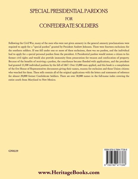 Following the Civil War, many of the men who were not given amnesty in the general amnesty proclamations were required to apply for a "special pardon" granted by President Andrew Johnson. There were fourteen exclusions for the southern soldiers. If one fell under one or more of these exclusions, there was no pardon, and the individual had to apply for a special personal pardon from the president. A Presidential pardon would restore a citizen to his former civil rights and would also provide immunity from prosecution for treason and confiscation of property. Because of the benefits of receiving a pardon, the courthouse became flooded with applications, and the president had granted 13,500 individual pardons by the fall of 1867. Over 15,000 men applied, and this book is a compilation of the five House of Representatives documents giving their names, reasons for exclusion and those Union citizens who vouched for them. These rolls contain all of the original applications with the letters and statements of reference for almost 20,000 former Confederate Soldiers. There are over 30,000 names in the full-name index covering the entire south from Maryland to New Mexico.