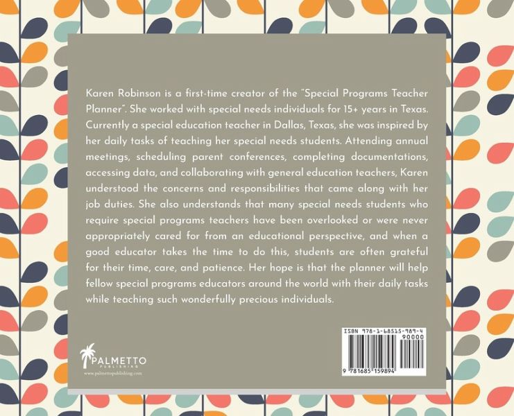 Karen Robinson is a ¿rst-time creator of the "Special Programs Teacher Planner". She worked with special needs individuals for 15+ years in Texas. Currently a special education teacher in Dallas, Texas, she was inspired by her daily tasks of teaching her special needs students. Attending annual meetings, scheduling parent conferences, completing documentations, accessing data, and collaborating with general education teachers, Karen understood the concerns and responsibilities that came along with her job duties. She also understands that many special needs students who require special programs teachers have been overlooked or were never appropriately cared for from an educational perspective, and when a good educator takes the time to do this, students are often grateful for their time, care, and patience. Her hope is that the planner will help fellow special programs educators around the world with their daily tasks while teaching such wonderfully precious individuals.