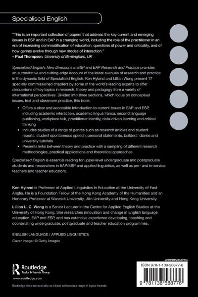 Specialised English: New Directions in ESP and EAP Research and Practice provides an authoritative and cutting-edge account of the latest avenues of research and practice in the dynamic field of Specialised English. Ken Hyland and Lillian Wong present 17 specially commissioned chapters by some of the world's leading experts to offer discussions of key topics in research, theory and pedagogy from a variety of international perspectives. Divided into three sections, which focus on conceptual issues, text and classroom practice, this book: Offers a clear and accessible introduction to current issues in EAP and ESP, including academic interaction, academic lingua franca, second language publishing, workplace talk, practitioner identity, data-driven learning and critical thinking Includes studies of a range of genres such as research articles and student reports, student spontaneous speech, personal statements, builders' diaries and university tutorials Presents links between theory and practice with a sampling of different research methodologies, practical applications and theoretical approaches Specialised English is essential reading for upper-level undergraduate and postgraduate students and researchers in EAP/ESP and applied linguistics, as well as pre- and in-service teachers and teacher educators.