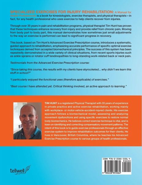SPECIALIZED EXERCISES FOR INJURY REHABILITATION: A Manual for Health Professionals is a book for kinesiologists, exercise therapists, and physical therapists-in fact, for any health professional who uses exercise to help clients recover from injuries. Through over 35 years in pain and rehabilitation programs, physical therapist Tim Hunt has proven that these techniques enhance recovery from injury and provide relief from chronic pain. Moving from body part to body part, this manual demonstrates how sometimes just small adjustments to the way an exercise is performed can lead to significant progress in recovery. This book, based on Tim Hunt's Advanced Exercise Prescription course, introduces a systematic, guided approach to rehabilitation, emphasizing accurate performance of specific optimal exercise techniques derived from accepted biomechanical principles. The success of this system has been repeatedly demonstrated in a wide variety of clinical situations, from recent sports injuries such as ankle sprains or rotator cuff tendinopathies to long-standing work-related back or neck pain. Testimonials from the Advanced Exercise Prescription course: "Since taking this course, the results with my clients have skyrocketed... why didn't we learn this stuff in school?" "I particularly enjoyed the functional uses (therefore applicable) of exercises." "Best course I have attended yet. Critical thinking involved, an active approach to learning."
