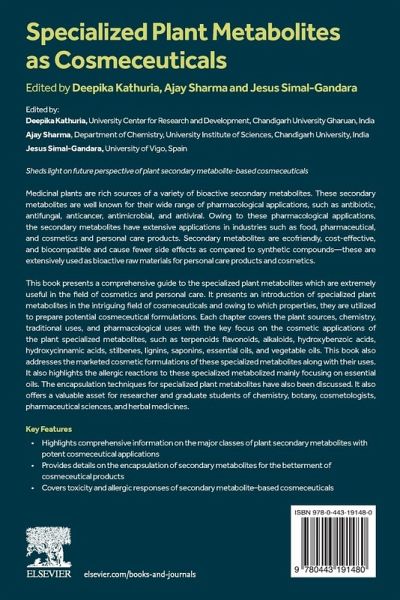 Specialized Plant Metabolites as Cosmeceuticals presents a comprehensive guide to traditional medicinal plants that are used in the field of cosmetics. Chapters cover geographical distribution, extraction of key components from each plant, traditional uses, pharmacognostic characteristics, phytochemistry, pharmacology, toxicology, and future prospects. This book will be a valuable asset for researchers and graduate students of chemistry, botany, biotechnology, microbiology, cosmetology and the pharmaceutical sciences. As medicinal plants are a rich source of a variety of bioactive secondary metabolites, their wide range of pharmacological applications as antibiotics, antifungals, anticancer agents, and antimicrobial and antiviral applications provide new and exciting avenues. In addition, they have great implications for the food, pharmaceutical, cosmetics and personal care product industries. Secondary metabolites also ecofriendly, cost effective, biocompatible, and cause less side effects as compare to synthetic compounds.