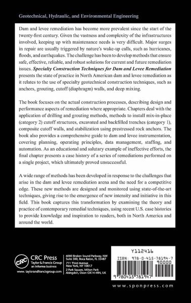 Dam and levee remediation has become more prevalent since the start of the twenty-first century. Given the vastness and complexity of the infrastructures involved, keeping up with maintenance needs is very difficult. Major surges in repair are usually triggered by nature's wake-up calls, such as hurricanes, floods, and earthquakes. The challenge has been to develop methods that ensure safe, effective, reliable, and robust solutions for current and future remediation issues. Specialty Construction Techniques for Dam and Levee Remediation presents the state of practice in North American dam and levee remediation as it relates to the use of specialty geotechnical construction techniques, such as anchors, grouting, cutoff (diaphragm) walls, and deep mixing. The book focuses on the actual construction processes, describing design and performance aspects of remediation where appropriate. Chapters deal with the application of drilling and grouting methods, methods to install mix-in-place (category 2) cutoff structures, excavated and backfilled trenches (category 1), composite cutoff walls, and stabilization using prestressed rock anchors. The book also provides a comprehensive guide to dam and levee instrumentation, covering planning, operating principles, data management, staffing, and automation. As an educational and salutary example of ineffective efforts, the final chapter presents a case history of a series of remediations performed on a single project, which ultimately proved unsuccessful. A wide range of methods has been developed in response to the challenges that arise in the dam and levee remediation arena and the need for a competitive edge. These new methods are designed and monitored using state-of-the-art techniques, giving rise to the emergence of new intensity and initiative in this field. This book captures this transformation by examining the theory and practice of contemporary remedial techniques, using recent U.S. case histories to provide knowledge and inspiration to readers, both in North America and around the world.