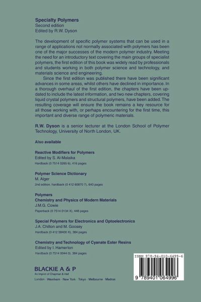 R. W. DYSON There will be few readers of this book who are not aware of the contribution that polymers make to modern life. They are to be seen around the home, at work, in transport and in leisure pursuits. They take many forms which include plastic mouldings and extrusions, plastic film and sheet, plastic laminates (fibreglass and formica), rubber gloves, hoses, tyres and sealing rings, fibres for textiles and carpets and so on, cellular products for cushioning and thermal insulation, adhesives and coating materials such as paints and varnishes. The majority of these polymers are synthetic and are derived from oil products. The most important of these in terms of tonnage used are polymers based upon styrene, vinyl chloride, ethylene, propylene and butadiene among plastics and rubber materials, and nylons, polyethyleneterephthalate and poly acrylonitrile among fibres. The total amount of these polymers used each year runs into millions of tonnes. These polymers are sometimes known as commodity polymers because they are used for everyday artefacts. They are available in many grades and formats to meet a variety of applications and processing techniques. The properties can be adjusted by using additives such as heat and light stabilizers, plasticizers, and reinforcing materials. Often, grades are specially designed and formulated to meet particular requirements and, in a sense, these might be regarded as specialities. Much has been written about these materials elsewhere and they are not the concern of this book.