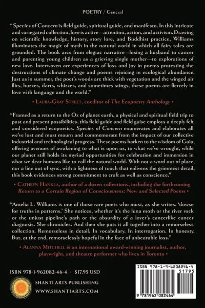 Poems in Species of Concern examine braided journeys of personal loss and environmental grief, of grasping and letting go. Each section opens with a poem set in a speculative future; subsequent poems return readers to the teeming planet we inhabit, where grounding practices of mindfulness allow us to manage many species of concern, humans among them, both vulnerable and culpable. Throughout the collection are persona poems in which strong female figures, many of them mythical-Anemone, the Sieve Angel, the spider, the red velvet ant, and others-take a stand. These guides dare to break the fourth wall and speak directly to the world; they defy their reputations and talk back. This collection commemorates and rejoices in Appalachian and Piedmont landscapes and species, with stories of resilience and hopes for the future.