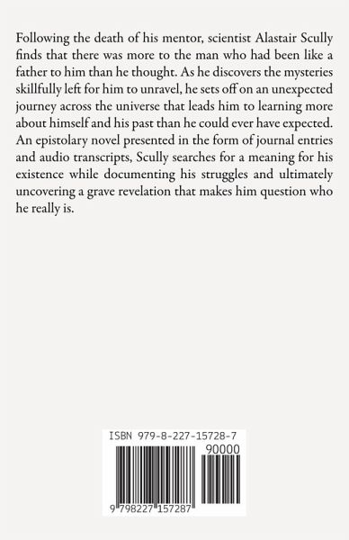 Following the death of his mentor, scientist Alastair Scully finds that there was more to the man who had been like a father to him than he thought. As he discovers the mysteries skillfully left for him to unravel, he sets off on an unexpected journey across the universe that leads him to learning more about himself and his past than he could ever have expected. An epistolary novel presented in the form of journal entries and audio transcripts, Scully searches for a meaning for his existence while documenting his struggles and ultimately uncovering a grave revelation that makes him question who he really is.