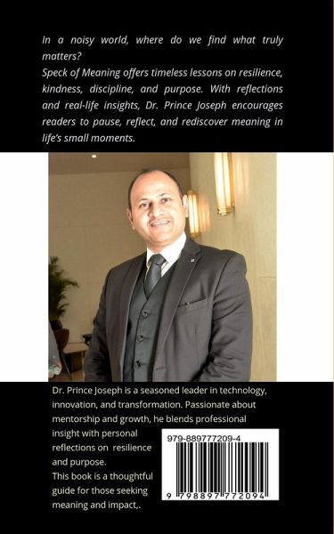 n a world full of noise, where does one find meaning? Speck of Meaning is an insightful exploration of the principles, challenges, and guiding philosophies that shape our lives. Dr. Prince Joseph delves into the timeless wisdom of success, resilience, discipline, kindness, and responsibility, weaving together practical insights, historical references, and real-life applications. Through a thought-provoking narrative, this book challenges readers to reflect on their personal values, decisions, and aspirations. Whether you are seeking direction, inspiration, or a deeper understanding of life's journey, this book serves as a compass for navigating the complexities of the modern world. Filled with stories of perseverance, lessons in leadership, and reflections on human potential, Speck of Meaning invites you to embrace your own journey and uncover the profound impact of even the smallest moments.