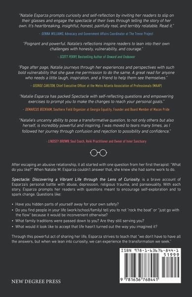 After escaping an abusive relationship, it all started with one question from her first therapist: "What do you like?" When Natalie M. Esparza couldn't answer that, she knew she had some work to do. Spectacle: Discovering a Vibrant Life through the Lens of Curiosity, is a brave account of Esparza's personal battle with abuse, depression, religious trauma, and pansexuality. With each story, Esparza prompts her readers with questions meant to encourage self-exploration and to spark change. Questions like: Have you hidden parts of yourself away for your own safety? Do you find people in your life (work/school/family) tell you to not "rock the boat" or "just go with the flow" because it would be inconvenient otherwise? What family traditions were passed down to you? Are they still serving you? What would it look like to accept that life hasn't turned out the way you imagined it? Through this powerful act of sharing her life, Esparza strives to teach that "we don't have to have all the answers, but when we lean into curiosity, we can experience the transformation we seek."