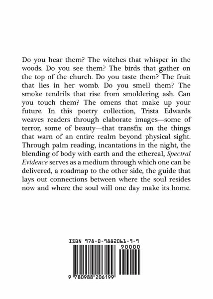 Do you hear them? The witches that whisper in the woods. Do you see them? The birds that gather on the top of the church. Do you taste them? The fruit that lies in her womb. Do you smell them? The smoke tendrils that rise from smoldering ash. Can you touch them? The omens that make up your future. In this poetry collection, Trista Edwards weaves readers through elaborate images-some of terror, some of beauty-that transfix on the things that warn of an entire realm beyond physical sight. Through palm reading, incantations in the night, the blending of body with earth and the ethereal, Spectral Evidence serves as a medium through which one can be delivered, a roadmap to the other side, the guide that lays out connections between where the soul resides now and where the soul will one day make its home.