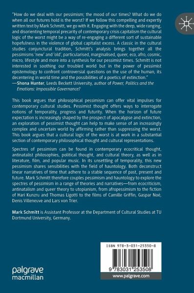 Spectres of pessimism can be found in contemporary ecocritical thought, antinatalist philosophies, political thought, and cultural theory, as well as in literature, film, and popular music. In its unsettling of temporality, this new pessimism shares sensibilities with the field of hauntology. Both deconstruct linear narratives of time that adhere to a stable sequence of past, present and future. Mark Schmitt therefore couples pessimism and hauntology to explore the spectres of pessimism in a range of theories and narratives-from ecocriticism, antinatalism and queer theory to utopianism, from afropessimism to the fiction of Hari Kunzru and Thomas Ligotti to the films of Camille Griffin, Gaspar Noé, Denis Villeneuve and Lars von Trier.