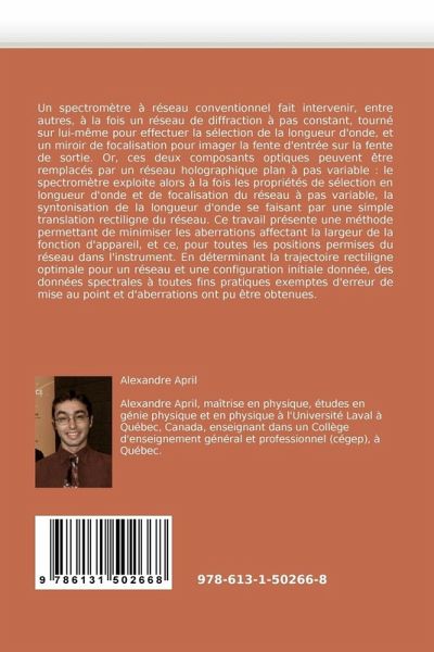 Un spectromètre à réseau conventionnel fait intervenir, entre autres, à la fois un réseau de diffraction à pas constant, tourné sur lui-même pour effectuer la sélection de la longueur d'onde, et un miroir de focalisation pour imager la fente d'entrée sur la fente de sortie. Or, ces deux composants optiques peuvent être remplacés par un réseau holographique plan à pas variable: le spectromètre exploite alors à la fois les propriétés de sélection en longueur d'onde et de focalisation du réseau à pas variable, la syntonisation de la longueur d'onde se faisant par une simple translation rectiligne du réseau. Ce travail présente une méthode permettant de minimiser les aberrations affectant la largeur de la fonction d'appareil, et ce, pour toutes les positions permises du réseau dans l'instrument. En déterminant la trajectoire rectiligne optimale pour un réseau et une configuration initiale donnée, des données spectrales à toutes fins pratiques exemptes d'erreur de mise au point et d'aberrations ont pu être obtenues.