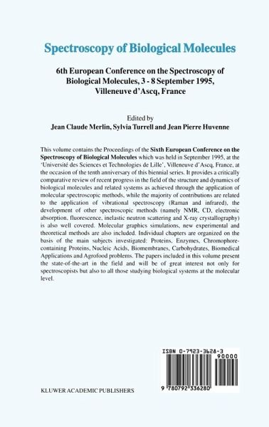 This volume contains the texts of lectures and posters presented at the Sixth European Conference on the Spectroscopy of Biological Molecules (ECSBM), held at the "Universite des Sciences et Technologies de Lille", Villeneuve d'Ascq, France rd th from 3 to 8 September 1995 at the occasion of the tenth anniversary of the Conference. During a NATO Summer School "Infrared and Raman Spectroscopy of Biological Molecules", organized by C. Sandorfy and T. Theophanides in Maratea (Italy) in 1983, a group of spectroscopists decided to organize a regular European meeting to check the lastest research results obtained by the different groups working in this field and to promote new cooperation between spectroscopists, biophysicists, biochemists and physicians. Since then ECSBM has been held biennially at Reims, France (1985), Freiburg, Germany (1987), Rimini, Italy (1989), York, United Kingdom (1991) and Loutraki, Greece (1993). The great increase in both the number of participants in this International Conference and in their countries of origin (from many countries outside as well as within Europe) during the last ten years has proved the necessity of this kind of meeting and the prosperity of this field of research.