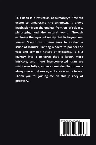 Our world is shaped by the limits of our perception, confined by the edges of what we can see, hear, and touch. Yet, just beyond these boundaries lies a vast and invisible universe teeming with forces and phenomena that quietly govern our reality. As human beings, we are naturally inclined to seek answers, to illuminate the dark corners of the unknown, and to stretch the boundaries of our understanding. In Spectrums Unseen, we embark on a journey to explore these hidden dimensions, examining the cosmic, the microscopic, and the theoretical in pursuit of a deeper understanding of the universe and our place within it. From the dark matter that holds galaxies together to the fractal patterns that underlie the structure of nature, from the microbial ecosystems within our bodies to the possible existence of multiple dimensions, this book aims to reveal the invisible architectures that shape our world. As we navigate these uncharted territories, we find that our reality is built upon layers of complexity, where each layer offers a glimpse into the interconnectedness of all things. We discover that the universe is not only more immense than we imagine, but also more wondrously connected - a tapestry of visible and invisible threads, woven together in a dance that extends beyond our senses.