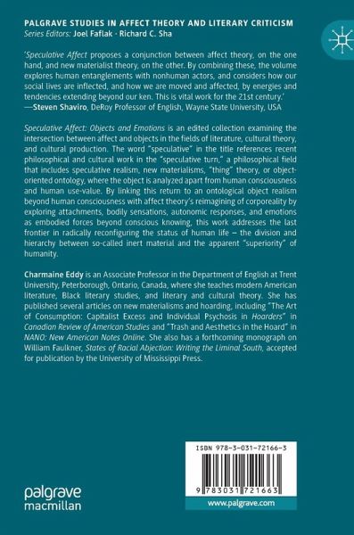 Section One: Introduction.- Chapter 1: Speculative Affect: An Introduction by Charmaine Eddy.- Section Two: Theorizing Speculative Affect.- Chapter 2: The Speculative Garden.- Chapter 3: Untimely Materialist Meditations on Affect.- Chapter 4: Does the Object Feel? Toward a Theory of Speculative Affect.- Section Three: Speculative Affect and Ecological Precarity.- Chapter 5: Tracing Waves.- Chapter 6: "It Would Be So Nice If This Were a Dream": Reading the Tohoku Earthquake through Affect Theory.- Section Four: The Affective Object of Art.- Chapter 7: Settler Imbroglios and Affective-Ecological Entanglements in the Work of Peter von Tiesenhausen, Kara Springer, and Jin-me Yoon.- Chapter 8: Nomadic Objects in Unhappy Lands: History, Memory, and Affect in Joanna Rajkowska's Public Projects Carried out in Warsaw (2002-present).- Chapter 9: Ontogenesis as Revolt: René Magritte's Universe.