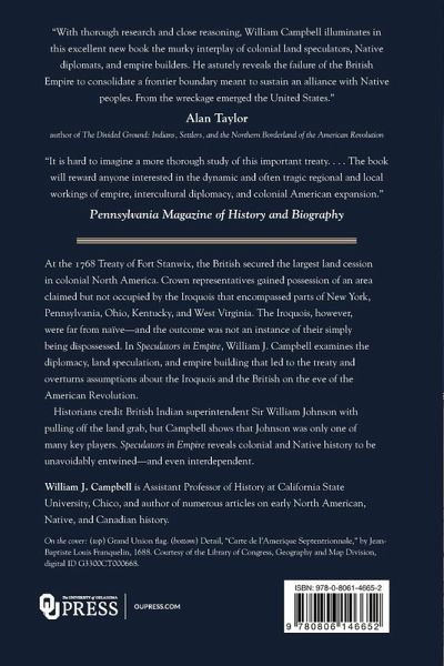 Explores the Iroquois-British diplomacy leading up to the treaty At the 1768 Treaty of Fort Stanwix, the British secured the largest land cession in colonial North America. Crown representatives gained possession of an area claimed but not occupied by the Iroquois that encompassed parts of New York, Pennsylvania, Ohio, Kentucky, and West Virginia. The Iroquois, however, were far from naïve-and the outcome was not an instance of their simply being dispossessed by Europeans. In Speculators in Empire, William J. Campbell examines the diplomacy, land speculation, and empire building that led up to the treaty. His detailed study overturns common assumptions about the roles of the Iroquois and British on the eve of the American Revolution. Through the treaty, the Iroquois directed the expansion of empire in order to serve their own needs while Crown negotiators obtained more territory than they were authorized to accept. How did this questionable transfer happen, who benefited, and at what cost? Campbell unravels complex intercultural negotiations in which colonial officials, land speculators, traders, tribes, and individual Indians pursued a variety of agendas, each side possessing considerable understanding of the other's expectations and intentions. Historians have credited British Indian superintendent Sir William Johnson with pulling off the land grab, but Campbell shows that Johnson was only one of many players. Johnson's deputy, George Croghan, used the treaty to capitalize on a lifetime of scheming and speculation. Iroquois leaders and their peoples also benefited substantially. With keen awareness of the workings of the English legal system, they gained protection for their homelands by opening the Ohio country to settlement. Campbell's navigation of the complexities of Native and British politics and land speculation illuminates a time when regional concerns and personal politicking would have lasting consequences for the continent. As Speculators in Empire shows, colonial and Native history are unavoidably entwined, and even interdependent. William J. Campbell is Assistant Professor of History at California State University, Chico, and author of numerous articles on early North American, Native, and Canadian history.