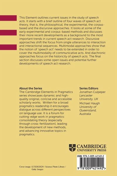This Element outlines issues in the study of speech acts. Discursive approaches shift the focus to interaction and interactional sequences. Multimodal approaches show that the speech act needs to be extended to cover the multimodality of communicative acts. Diachronic approaches focus on the historicity of speech acts.