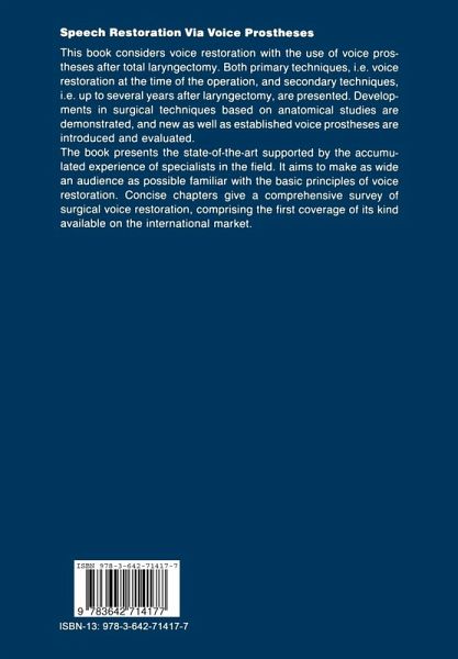 Historical Perspective.- 1 The Different Types of Voice Prostheses.- The Simple Semi-Permanent Supratracheal Valve Prosthesis after Total Laryngectomy.- A Second Generation Artificial Larynx Prosthesis - A Comparative Clinical Evaluation.- The Groningen Voice Prosthesis for Secondary Voice Rehabilitation after Total Laryngectomy.- The Groningen Voice Prosthesis for Voice Rehabilitation During Total Laryngectomy.- The Groningen Button Results.- Voice Rehabilitation after Laryngectomy with the Groningen Voice Prosthesis: Experiences Made in Nijmegen.- The Phoniatric Results of Our Voice Prostheses (36 Cases).- The Hypopharyngeal Puncture.- Our Experiences with Delayed Primary Voice Rehabilitation.- Assessment and Management Protocol for Tracheo-Oesophageal "Puncture" Procedures.- 2 Experimental Research Regarding the Function and Handling of Voice Prostheses.- Physical Aspects of Tracheo-Oesophageal Shunt Prostheses (Pressure - Flow Measurements of a Model Prosthesis).- In Vitro Experiments Using Valve Prostheses.- Wear and Tear on the Silicon of Valve Prostheses in the Upper Digestive Tract - A Study Using Electron Microscope Scanning.- Biocompatibility of Plastic Materials.- 3 In Vivo Experiments Using Voice Prostheses.- Aerodynamic Properties of Buttons and Button-Assisted Oesophageal Speech.- In Vivo Experiments Using Valve Prostheses - Resistance and Pressure/ Time Measurement.- 4 Problems Occurring with the Inferior Pharyngeal Muscle and Their Possible Solutions.- Function of the Pharynx and Killian Mouth in Voice Production with Our Prosthesis.- The Anatomy of the Larynx, Pharynx and Cervical Oesophagus in Relation to Surgical Voice Restoration.- Glottoplasty with Functional Pharynx Surgery and Tracheostomaplasty.- 5 Indications, Results and Their Meansof Evaluation.- Possible Ways of Reconstructing the Pharynx with a One-Step Operation while Attempting Voice Restoration.- Problem of the Indications for the Use of a Valved Prosthesis.- Lung Function Tests in Laryngectomized Patients.- Evaluation of Speech with and Without a "Groningen Type" Voice Button.- Intelligibility, Vocal Intensity, and Long-Term Average Spectra of Groningen Button-Oesophageal Speech.- The Postlaryngectomy Telephone Intelligibility Test (PLTT).- 4 Years Experience of Voice Production and Deglutition Using Valve Prostheses.- 6 Speech Training, Intelligibility and Psychosocial Aspects.- Speech Training of Oesophageal Voice with a Button.- Intelligibility and Psycho-Social Adjustment. A Comparison Between Patients with Oesophageal Voice and Patients with a Voice Prosthesis.- Social and Psychosocial Aspects of Vocal Rehabilitation in Laryngectomized Patients - Preliminary Results.- 7 Fingerless Voice Restoration.- Experiences with Surgical Voice Restoration.- Amatsu's Technique Using the Blom-Singer Tracheostoma Valve.- Fingerless Voice Restoration Using Amatsu's Technique.- Experience with the ESKA-Herrmann Tracheostoma Valve.- Implantation of the Recurrent Nerve and Its Possible Use as a Trigger for an Artificial Larynx.- 8 Experimental Research to Establish an Artificial Larynx.- Experimental Research to Establish an Artificial Larynx.