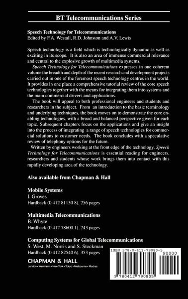 Speech technology for telecommunications. Introduction to human speech production, human hearing and speech analysis. Low rate speech coding for telecommunications. Speech transmission over digital mobile radio channels. The Laureate text to speech system architecture and applications. Overview of current text to speech techniques: Part 1 text and linguistic analysis. Overview of current text to speech techniques: Part 2 prosody and speech generation. Beyond intelligibility the performance of text to speech synthesizers. The listening telephone automating speech recognition over the PSTN. Advances in telephony based speech recognition. Speech recognition making it work for real. Are speech recognizers still 98% accurate, or has the time come to repeal 'Hyde's Law'? Speech enhancement. Assessing human perception. Interactive speech systems for telecommunications applications. Issues in large vocabulary interactive speech systems. Spoken language systems beyond prompt and response. Whither speech? the future of telephony. Index.
