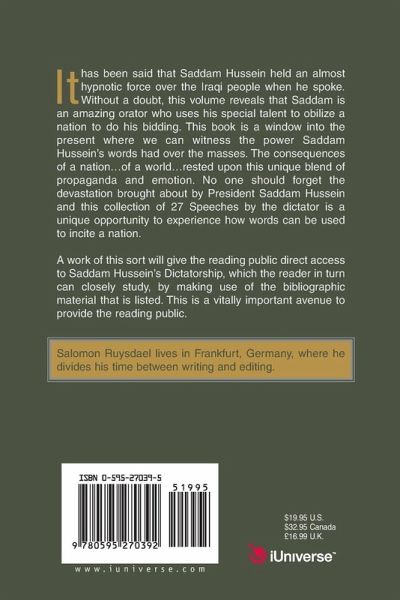 It has been said that Saddam Hussein held an almost hypnotic force over the Iraqi people when he spoke. Without a doubt, this volume reveals that Saddam is an amazing orator who uses his special talent to obilize a nation to do his bidding. This book is a window into the present where we can witness the power Saddam Hussein's words had over the masses. The consequences of a nation... of a world... rested upon this unique blend of propaganda and emotion. No one should forget the devastation brought about by President Saddam Hussein and this collection of 27 Speeches by the dictator is a unique opportunity to experience how words can be used to incite a nation.