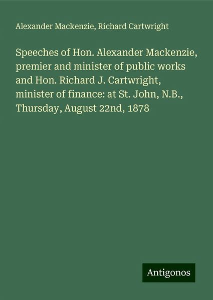Speeches of Hon. Alexander Mackenzie, premier and minister of public works and Hon. Richard J. Cartwright, minister of finance: at St. John, N.B., Thursday, August 22nd, 1878 - Mackenzie, Alexander; Cartwright, Richard