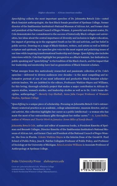 Speechifying collects the most important speeches of Dr. Johnnetta Betsch Cole-noted Black feminist anthropologist, the first Black female president of Spelman College, former director of the Smithsonian Institution's National Museum of African Art, and former chair and president of the National Council of Negro Women. A powerful and eloquent orator, Dr. Cole demonstrates her commitment to the success of historically Black colleges and universities, her ideas about the central importance of diversity and inclusion in higher education, the impact of growing up in the segregated South on her life and activism, and her belief in public service. Drawing on a range of Black thinkers, writers, and artists as well as biblical scripture and spirituals, her speeches give voice to the most urgent and polarizing issues of our time while inspiring transformational leadership and change. Speechifying also includes interviews with Dr. Cole that highlight her perspective as a Black feminist, her dedication to public speaking and "speechifying" in the tradition of the Black church, and the impact that her leadership and mentorship have had on generations of Black feminist scholars.