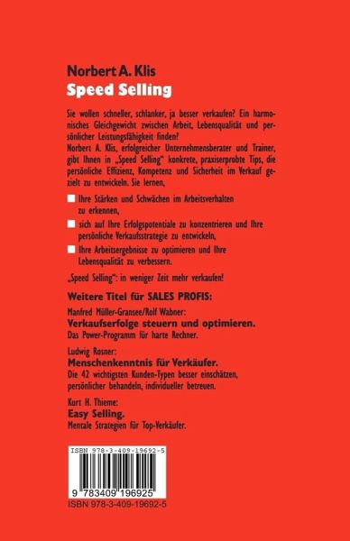 Der Nutzen dieses Buches.- Erfolgsverhalten, Streßfaktoren und Persönlichkeit.- Der Sinn von Arbeit und Leben: die persönliche Erfolgsstrategie.- Zeitfresser und Stressoren.- Die Gestaltung von Tages-, Jahres- und Lebensablauf.- Persönlichkeit und Erfolg.- Effektive Selbstorganisation.- Methoden der Arbeitsvereinfachung und Prioritätensetzung.- Management by Zeitplanbuch.- Rationelles Lesen, Korrespondieren, Telefonieren und Post erledigen.- Die zehn wichtigsten Prinzipien des Zeitmanagements.- Führung, Kooperation und Steuerung im Verkauf.- Direktmarketing und persönliche Kommunikation.- Planung und Steuerung des Außendienstes.- Kooperation und Motivation im Vertrieb.- Verkaufen mit System.- Wirkungsvolle Werbebriefe.- Mehr Erfolg am Telefon.- Das persönliche Kundengespräch.- Die vier Stufen zum Verkaufserfolg: Kontaktaufnahme, Bedarfsermittlung, Angebot, Abschluß.- Wirkungsvolle Kommunikation.- Das erfolgreiche Gespräch, oder: rationelles Besuchsmanagement anwenden.- Vorschläge für Reden und Vorträge.- Spielregeln für Konferenzen und Besprechungen.- Die optimale Präsentation.- Nachwort: Die zehn Gebote des Speed Selling.- Literatur.- Der Autor.