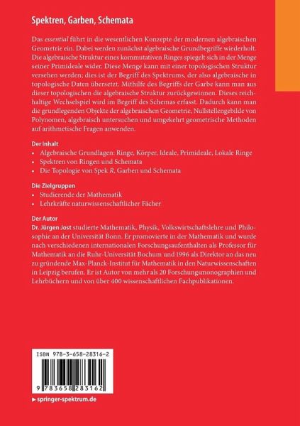 Das essential führt in die wesentlichen Konzepte der modernen algebraischen Geometrie ein. Dabei werden zunächst algebraische Grundbegriffe wiederholt. Die algebraische Struktur eines kommutativen Ringes spiegelt sich in der Menge seiner Primideale wider. Diese Menge kann mit einer topologischen Struktur versehen werden; dies ist der Begriff des Spektrums, der also algebraische in topologische Daten übersetzt. Mithilfe des Begriffs der Garbe kann man aus dieser topologischen die algebraische Struktur zurückgewinnen. Dieses reichhaltige Wechselspiel wird im Begriff des Schemas erfasst. Dadurch kann man die grundlegenden Objekte der algebraischen Geometrie, Nullstellengebilde von Polynomen, algebraisch untersuchen und umgekehrt geometrische Methoden auf arithmetische Fragen anwenden.