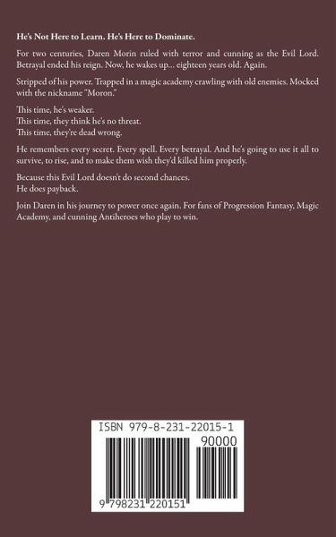 He's Not Here to Learn. He's Here to Dominate. For two centuries, Daren Morin ruled with terror and cunning as the Evil Lord. Betrayal ended his reign. Now, he wakes up... eighteen years old. Again. Stripped of his power. Trapped in a magic academy crawling with old enemies. Mocked with the nickname "Moron." This time, he's weaker. This time, they think he's no threat. This time, they're dead wrong. He remembers every secret. Every spell. Every betrayal. And he's going to use it all to survive, to rise, and to make them wish they'd killed him properly. Because this Evil Lord doesn't do second chances. He does payback. Join Daren in his journey to power once again. For fans of Progression Fantasy, Magic Academy, and cunning Antiheroes who play to win.
