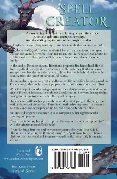 Haylee feels something amazing… and her new abilities are only part of it. An empathic girl… with evil lurking beneath the surface. A perilous quest into uncharted territory… And devastating implications for her people's freedom. In Animal Empath, Haylee manifested her gift, and she found a temporary solution for saving her mother from her father. But in the sequel Spell Creator, he isn't finished with them yet, and as it turns out, the evil runs deeper than her family. In the land of Panoi, an ancient dragon and prophetic fire fairies head Haylee down a path of destiny. She hasn't even gone through the Gift Rites or learned any spells yet, but she must find a way to leave her family behind and save her country from the tyrant emperor's mind control. She has a plan-a quest her great-grandfather set for her before his soul passed on. There is magic that could protect people's minds, but she must uncover it first. With the help of a snarky flying carpet and an unlikely rescue party sent by the king of Panoi-shi Province, she seeks out a spell creator. He won't be easy to find, as he's been in hiding since he left the tyrant's employ. Haylee's quest will take her places she never dreamt of going: to the dangerous wild lands, west of the border. There lie unpredictable creatures, like orcs and dragons, exiled for developing an unstoppable hunger for human flesh. But orcs and dragons are a piece of cake compared to her nightmare of a traveling companion. Can she avoid letting her gift corrupt her the way her father's corrupted him? Will she take the more difficult path? If you like feisty characters and new magic systems, then you'll love C. E. R. Ellwood's second YA Fantasy tale. Buy Spell Creator today to book a flight to this new world and immerse yourself in this irresistibly fun magical adventure.