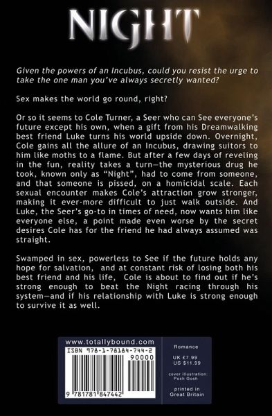 Given the powers of an Incubus, could you resist the urge to take the one man you've always secretly wanted? Sex makes the world go round, right? Or so it seems to Cole Turner, a Seer who can See everyone's future except his own, when a gift from his Dreamwalking best friend Luke turns his world upside down. Overnight, Cole gains all the allure of an Incubus, drawing suitors to him like moths to a flame. But after a few days of revelling in the fun, reality takes a turn-the mysterious drug he took, known only as "Night", had to come from someone, and that someone is pissed, on a homicidal scale. Each sexual encounter makes Cole's attraction grow stronger, making it ever-more difficult to just walk outside. And Luke, the Seer's go-to in times of need, now wants him like everyone else, a point made even worse by the secret desires Cole has for the friend he had always assumed was straight. Swamped in sex, powerless to See if the future holds any hope for salvation, and at constant risk of losing both his best friend and his life, Cole is about to find out if he's strong enough to beat the Night racing through his system-and if his relationship with Luke is strong enough to survive it as well.