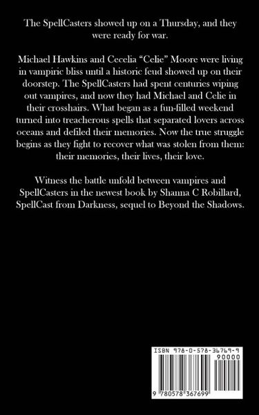 The SpellCasters showed up on a Thursday, and they were ready for war. Michael Hawkins and Cecelia "Celie" Moore were living in vampiric bliss until a historic feud showed up on their doorstep. The SpellCasters had spent centuries wiping out vampires, and now they had Michael and Celie in their crosshairs. What began as a fun-filled weekend turned into treacherous spells that separated lovers across oceans and defiled their memories. Now the true struggle begins as they fight to recover what was stolen from them: their memories, their lives, their love. Witness the battle unfold between vampires and SpellCasters in the newest book by Shanna C Robillard, SpellCast from Darkness, sequel to Beyond the Shadows.