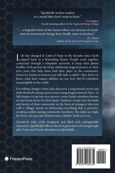 Life has changed at Life of Hope in the decades since Earth tipped back to a flourishing biome. People work together, connected through a telepathic network, to keep their planet healthy. Each person develops additional magical powers in their teen years that help them find their place in the community. However, Fania's seventeen-year-old, Saki, is adrift-they don't yet know what their unique abilities are nor how they'll contribute meaningfully to the world. Everything changes when Saki discovers a long-buried secret and finds themself raising a precocious young dragon named Chiyo. As Saki begins to tap into new powers, some family members foresee an uncertain future for their lands. Darkness creeps into the lands and hearts of their community in the form of strangers who join with a villager intent on destroying everything that is precious, creating conflict among community members. The stakes are high, for those who prevail will determine whether Earth survives. Sensitively told, richly imagined, and filled with unforgettable characters, Spelldrifts follows the next generation of young people after Fania and Nuna's adventures in Spindrifts.