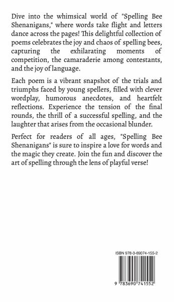 Dive into the whimsical world of "Spelling Bee Shenanigans," where words take flight and letters dance across the pages! This delightful collection of poems celebrates the joy and chaos of spelling bees, capturing the exhilarating moments of competition, the camaraderie among contestants, and the joy of language. Each poem is a vibrant snapshot of the trials and triumphs faced by young spellers, filled with clever wordplay, humorous anecdotes, and heartfelt reflections. Experience the tension of the final rounds, the thrill of a successful spelling, and the laughter that arises from the occasional blunder. Perfect for readers of all ages, "Spelling Bee Shenanigans" is sure to inspire a love for words and the magic they create. Join the fun and discover the art of spelling through the lens of playful verse!
