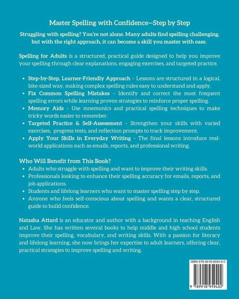 Struggling with spelling? You're not alone-this book will help you gain confidence and improve your skills. Do you second-guess yourself when writing emails, filling out forms, or texting at work? You're not alone-many adults still struggle with spelling, even in today's digital world. Spelling for Adults is designed specifically to make spelling easier, more intuitive, and stress-free for adult learners. If you're looking to improve your spelling for work, education, or everyday writing, this book guides you through a structured, step-by-step approach to mastering essential rules and avoiding common mistakes. Who Will Benefit from This Book?Adults who struggle with spelling and want to improve their writing skills. Professionals looking to enhance their spelling accuracy for emails, reports, and job applications. Students and lifelong learners who want to master spelling step by step. Anyone who feels self-conscious about spelling and wants a clear, structured guide to build confidence. What You'll Learn Inside this Book:Step-by-Step, Learner-Friendly Approach - Lessons are structured in a logical, bite-sized way, making complex spelling rules easy to understand and apply. Fix Common Spelling Mistakes - Identify and correct the most frequent spelling errors while learning proven strategies to reinforce proper spelling. Memory Aids - Use mnemonics and practical spelling techniques to make tricky words easier to remember. Targeted Practice & Self-Assessment - Strengthen your skills with varied exercises, progress tests, and reflection prompts to track improvement. Apply Your Skills in Everyday Writing - The final lessons introduce real-world applications such as emails, reports, and professional writing. Take the First Step Toward Stronger Spelling! If you're ready to write with confidence and accuracy, grab your copy of Spelling for Adults today and start improving your skills!