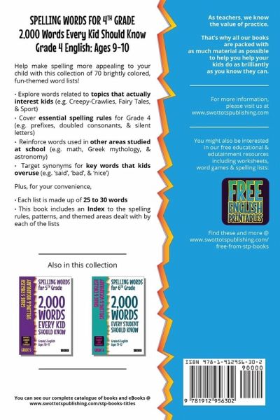 Help make spelling more appealing to your child with this collection of 70 brightly colored, fun-themed word lists! Explore words related to topics that actually interest kids (e.g. Creepy-Crawlies, Fairy Tales, & Sport) Cover essential spelling rules for Grade 4 (e.g. prefixes, doubled consonants, & silent letters) Reinforce words used in other areas studied at school (e.g. math, Greek mythology, & astronomy) Target synonyms for key words that kids overuse (e.g. 'said', 'bad', & 'nice') Plus, for your convenience, Each list is made up of 25 to 30 words This book includes an Index to the spelling rules, patterns, and themed areas dealt with by each of the lists Kindly note: this is the US edition of this book. The UK edition is also available.