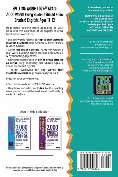 Help make spelling more appealing to your child with this collection of 70 brightly colored, fun-themed word lists! Explore words related to topics that actually interest students (e.g. Cinema & Film, Pirates, & Video Games) Cover essential spelling rules for Grade 6 (e.g. word building, using prefixes and suffixes, & hyphenating adjectives) Reinforce words used in other areas studied at school (e.g. chemistry, the Middle Ages, & Shakespearean English) Target synonyms for key words that students overuse (e.g. 'walk', 'easy', & 'said') Plus, for your convenience, Each list is made up of 25 to 30 words This book includes an Index to the spelling rules, patterns, and themed areas dealt with by each of the lists Kindly note: this is the US edition of this book. The UK edition is also available.