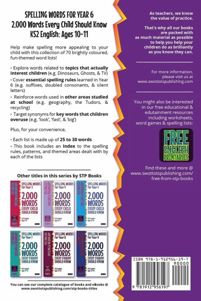 Help make spelling more appealing to your child with this collection of 70 brightly coloured, fun-themed word lists! Explore words related to topics that actually interest children (e.g. Dinosaurs, Ghosts, & TV) Cover essential spelling rules learned in Year 6 (e.g. suffixes, doubled consonants, & silent letters) Reinforce words used in other areas studied at school (e.g. geography, the Tudors, & recycling) Target synonyms for key words that children overuse (e.g. 'look', 'fast', & 'big') Plus, for your convenience,Each list is made up of 25 to 30 words This book includes an Index to the spelling rules, patterns, and themed areas dealt with by each of the lists