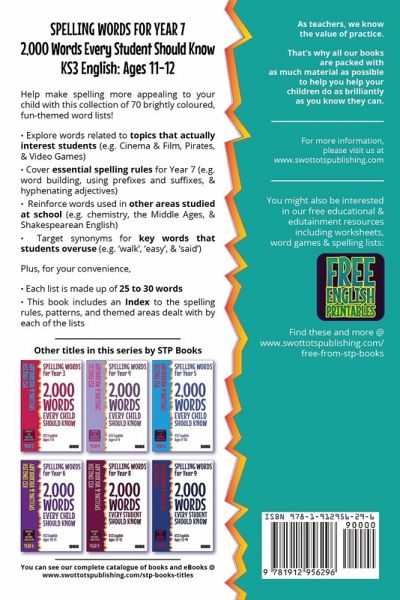 Help make spelling more appealing to your child with this collection of 70 brightly coloured, fun-themed word lists! Explore words related to topics that actually interest students (e.g. Cinema & Film, Pirates, & Video Games) Cover essential spelling rules for Year 7 (e.g. word building, using prefixes and suffixes, & hyphenating adjectives) Reinforce words used in other areas studied at school (e.g. chemistry, the Middle Ages, & Shakespearean English) Target synonyms for key words that students overuse (e.g. 'walk', 'easy', & 'said') Plus, for your convenience,Each list is made up of 25 to 30 words This book includes an Index to the spelling rules, patterns, and themed areas dealt with by each of the lists