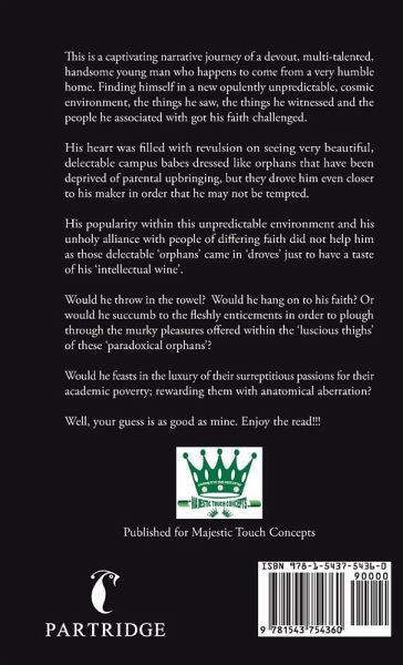 This is a captivating narrative journey of a devout, multi-talented, handsome young man who happens to come from a very humble home. Finding himself in a new opulently unpredictable, cosmic environment, the things he saw, the things he witnessed and the people he associated with got his faith challenged. His heart was filled with revulsion on seeing very beautiful, delectable campus babes dressed like orphans that have been deprived of parental upbringing, but they drove him even closer to his maker in order that he may not be tempted. His popularity within this unpredictable environment and his unholy alliance with people of differing faith did not help him as those delectable 'orphans' came in 'droves' just to have a taste of his 'intellectual wine'. Would he throw in the towel? Would he hang on to his faith? Or would he succumb to the fleshly enticements in order to plough through the murky pleasures offered within the 'luscious thighs' of these 'paradoxical orphans'? Would he feasts in the luxury of their surreptitious passions for their academic poverty; rewarding them with anatomical aberration? Well, your guess is as good as mine. Enjoy the read!!!