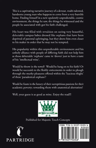 This is a captivating narrative journey of a devout, multi-talented, handsome young man who happens to come from a very humble home. Finding himself in a new opulently unpredictable, cosmic environment, the things he saw, the things he witnessed and the people he associated with got his faith challenged. His heart was filled with revulsion on seeing very beautiful, delectable campus babes dressed like orphans that have been deprived of parental upbringing, but they drove him even closer to his maker in order that he may not be tempted. His popularity within this unpredictable environment and his unholy alliance with people of differing faith did not help him as those delectable 'orphans' came in 'droves' just to have a taste of his 'intellectual wine'. Would he throw in the towel? Would he hang on to his faith? Or would he succumb to the fleshly enticements in order to plough through the murky pleasures offered within the 'luscious thighs' of these 'paradoxical orphans'? Would he feasts in the luxury of their surreptitious passions for their academic poverty; rewarding them with anatomical aberration? Well, your guess is as good as mine. Enjoy the read!!!