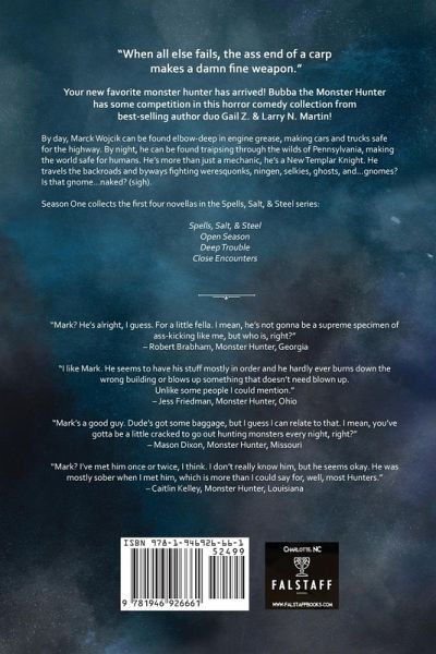 In Season One of Spells, Salt, & Steel, Mark Wocjik takes up the mantle of monster hunter after his familky is brutally murdered while on a hunting trip. In a collection of novellas that are far funnier than they have any right to be, Larry & Gail Martin bring Mark to live in the vein of Bubba the Monster Hunter and Ash v. the Evil Dead.
