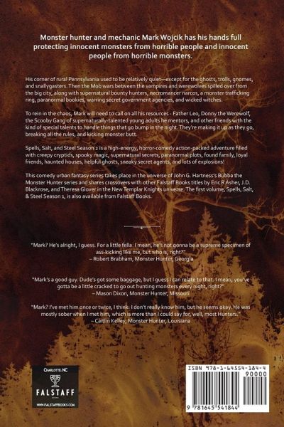 Monster hunter and mechanic Mark Wojcik has his hands full protecting innocent monsters from horrible people and innocent people from horrible monsters. His corner of rural Pennsylvania used to be relatively quiet-except for the ghosts, trolls, gnomes, and snallygasters. Then the Mob wars between the vampires and werewolves spilled over from the big city, along with supernatural bounty hunters, necromancer narcos, a monster trafficking ring, paranormal bookies, warring secret government agencies, and wicked witches. To rein in the chaos, Mark will need to call on all his resources - Father Leo, Donny the Werewolf, the Scooby Gang of supernaturally-talented young adults he mentors, and other friends with the kind of special talents to handle things that go bump in the night. They're making it up as they go, breaking all the rules, and kicking monster butt. Spells, Salt, and Steel Season 2 is a high-energy, horror-comedy action-packed adventure filled with creepy cryptids, spooky magic, supernatural secrets, paranormal plots, found family, loyal friends, haunted houses, helpful ghosts, sneaky secret agents, and lots of explosions! This comedy urban fantasy series takes place in the universe of John G. Hartness's Bubba the Monster Hunter series and shares crossovers with other Falstaff Books titles by Eric R Asher, J.D. Blackrose, and Theresa Glover in the New Templar Knights universe. The first volume, Spells, Salt, & Steel Season 1, is also available from Falstaff Books.