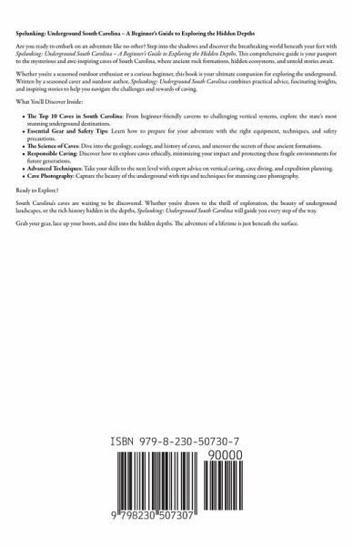 Spelunking: Underground South Carolina - A Beginner's Guide to Exploring the Hidden Depths Are you ready to embark on an adventure like no other? Step into the shadows and discover the breathtaking world beneath your feet with Spelunking: Underground South Carolina - A Beginner's Guide to Exploring the Hidden Depths. This comprehensive guide is your passport to the mysterious and awe-inspiring caves of South Carolina, where ancient rock formations, hidden ecosystems, and untold stories await. Whether you're a seasoned outdoor enthusiast or a curious beginner, this book is your ultimate companion for exploring the underground. Written by a seasoned caver and outdoor author, Spelunking: Underground South Carolina combines practical advice, fascinating insights, and inspiring stories to help you navigate the challenges and rewards of caving. What You'll Discover Inside:The Top 10 Caves in South Carolina: From beginner-friendly caverns to challenging vertical systems, explore the state's most stunning underground destinations. Essential Gear and Safety Tips: Learn how to prepare for your adventure with the right equipment, techniques, and safety precautions. The Science of Caves: Dive into the geology, ecology, and history of caves, and uncover the secrets of these ancient formations. Responsible Caving: Discover how to explore caves ethically, minimizing your impact and protecting these fragile environments for future generations. Advanced Techniques: Take your skills to the next level with expert advice on vertical caving, cave diving, and expedition planning. Cave Photography: Capture the beauty of the underground with tips and techniques for stunning cave photography. Why You'll Love This Book:For Beginners and Experts Alike: Whether you're taking your first steps into a cave or tackling advanced techniques, this guide has something for everyone. Actionable Advice: Each chapter includes practical tips, checklists, and step-by-step instructions to help you plan and execute your caving adventures. Inspiring Stories: Hear from experienced cavers and explorers who share their most memorable moments and lessons learned underground. Stunning Visuals: Featuring vivid descriptions and photography, this book brings the hidden world of caves to life. Who Is This Book For?Outdoor Enthusiasts: If you love hiking, camping, or exploring nature, caving is the next frontier. Adventure Seekers: For those who crave excitement and the thrill of discovery, caving offers endless opportunities for adventure. Families and Groups: Looking for a unique and educational activity? Caving is a great way to bond and create lasting memories. Nature Lovers: Caves are home to unique ecosystems and geological wonders that will leave you in awe. Ready to Explore? South Carolina's caves are waiting to be discovered. Whether you're drawn to the thrill of exploration, the beauty of underground landscapes, or the rich history hidden in the depths, Spelunking: Underground South Carolina will guide you every step of the way. Grab your gear, lace up your boots, and dive into the hidden depths. The adventure of a lifetime is just beneath the surface.