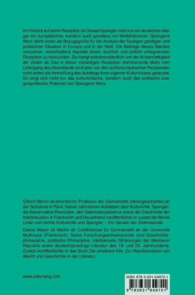 Inhalt: Alba Chouillou: Kulturkritik in Zeit und Raum. Spengler, Theodor Lessing und Leo Frobenius. Rezeptionsprozesse bei Ernst Bloch - Olivier Agard: Chancen des Aufstiegs und des Niedergangs. Max Schelers Spengler-Kritik - Markus Ophälders: Metamorphose, Ursprung, Untergang. Goethes Erbe in Spenglers Morphologie und Benjamins dialektischer Konstruktion von Erfahrung mit Geschichte - Daniel Meyer: «Geschichtslose Geschichte». Martin Heideggers Spengler-Rezeption - Maurizio Guerri: «Arbeit wird das große Wort des ethischen Nachdenkens». Über Spengler und Ernst Jünger - Alexander Demandt: Geschichtsbiologismus. Oswald Spengler und Konrad Lorenz - Alexandre Dupeyrix: Morphologie und Philosophie des Raums bei Spengler und Sloterdijk. Sloterdijk als Erbe Spenglers? - Arne De Winde: «Das Ende der Demokratie»? Spengler - Sloterdijk - Jirgl - Domenico Conte: Die Rezeption Spenglers in Italien - Gerald Stieg: Pierre Bertaux liest Spenglers Jahre der Entscheidung. Eine Miszelle - Michaël de Saint-Cheron : Malraux lecteur de Hegel et de Spengler - Gilbert Merlio: Auf den Spuren Spenglers bei Cioran. Von der «tapferen Skepsis» zum Ausstieg aus der Geschichte - Anke Birkenmaier: Spenglers Rezeption in Lateinamerika - Eddy Dufourmont : Spengler au Japon. L'inspiration de la « révolution conservatrice » dans l'asiatisme et le rejet de la démocratie - David Engels: «This is an extraordinary thing you've perhaps heard of ...». Die Rezeption Oswald Spenglers bei Francis Scott Fitzgerald - Zaur Gasimov: Spengler im heutigen Russland. Zur Neu-Eurasischen Rezeption der Kulturmorphologie - Makram Abbès : Spengler et la pensée arabo-musulmanne.