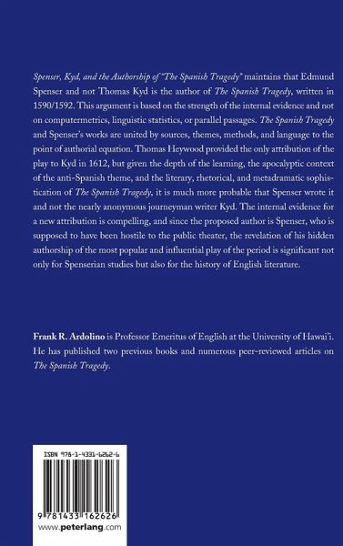 Spenser, Kyd, and the Authorship of "The Spanish Tragedy" maintains that Edmund Spenser and not Thomas Kyd is the author of The Spanish Tragedy, written in 1590/1592. This argument is based on the strength of the internal evidence and not on computermetrics, linguistic statistics, or parallel passages. The Spanish Tragedy and Spenser's works are united by sources, themes, methods, and language to the point of authorial equation. Thomas Heywood provided the only attribution of the play to Kyd in 1612, but given the depth of the learning, the apocalyptic context of the anti-Spanish theme, and the literary, rhetorical, and metadramatic sophistication of The Spanish Tragedy, it is much more probable that Spenser wrote it and not the nearly anonymous journeyman writer Kyd. The internal evidence for a new attribution is compelling, and since the proposed author is Spenser, who is supposed to have been hostile to the public theater, the revelation of his hidden authorship of the most popular and influential play of the period is significant not only for Spenserian studies but also for the history of English literature.